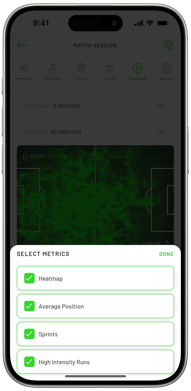 Tactical Playback gives a tactical insight to GPS data in any part of a match session. This allows you to dissect down to individual players or whole sections of the match.